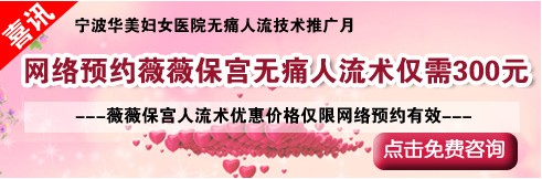 宁波华美医院是一家正规的人流医院,开展多种保宫无痛人流,其中3毫米薇薇保宫无痛人流手术费用网络预约只要300元,也就是薇薇保宫无痛人流手术费用只要300元,检查只要根据需要从十几元到一百元不等,术后B超费用网络预约免费复查。